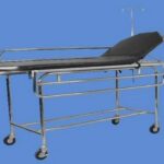 Estructura de tubo redondo de 1” cal 18 con barandales abatibles, acabado cromo plancha de lámina cal 22 esmaltada, cabecera de tres posiciones, cojín y porta sueros ruedas de 5” u 8” dos con freno y dos sin freno. Medidas 95x60x180