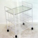 Estructura de varilla redondo de ¼ con dos rejillas, esmaltado en color blanco con pintura en polvo, rodajas de nylon de 40 mm. Cubierta de cristal, medidas 50 x 36 x 63.