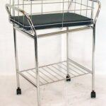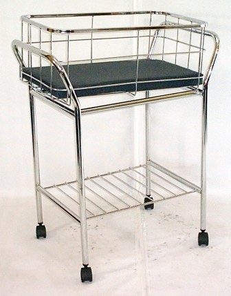 Estructura de tubo redondo cal 18 de 1”, ruedas de nylon de 2”, canastilla y parrilla de acero redondo pulido de 5/16 y 3/16 acabado cromo y cojín de espuma de 17 K. Forrado de vinil. Medidas 92 x 70 x 42
