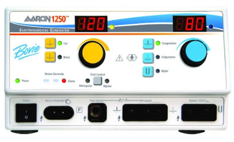 El Aaron 1250 de Bovie, cuenta con modos de corte, mezcla, coagulación, fulguración y bipolar.