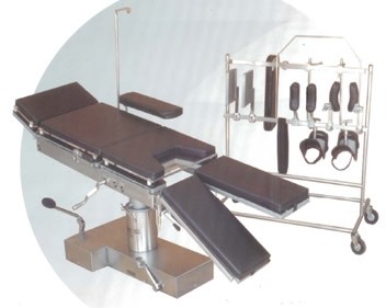 Mesa quirurgica universal con controles por medio de manivela, accionamiento mecanico hidraulico de los movimientos de elevacion y descenso por medio de un pedal