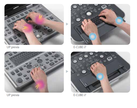 La ergonomía que no había visto antes. El E-CUBE i7 es el primer sistema de ultrasonido portátil en el mundo con una cubierta de teclado deslizante