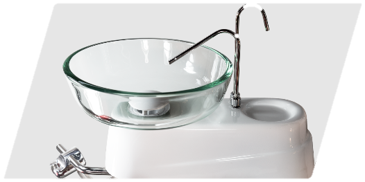 Taza de vidrio templado de 26 cms. desmontable para su fácil limpieza, con fuentes de taza y vaso en acero inoxidable ajustables y desmontables. Rejilla con tapa para escupidera desmontable, para la retención de sólidos.